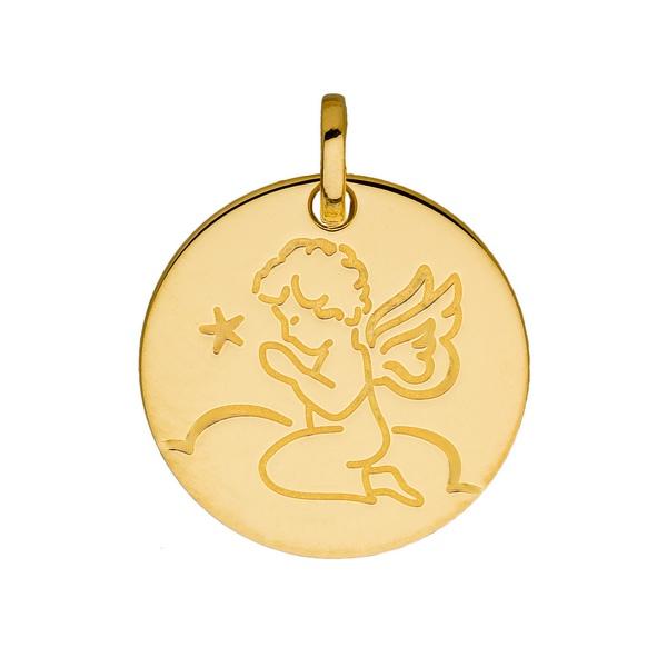 Pendentif Ange en Prière sur le nuage de 16 mm de diamètre en or jaune 375/1000 (9 carats poli. Gravure et livraison France métropolitaine offertes. A05318