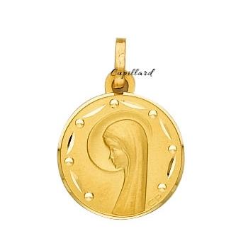 Cadeau idéal pour un baptème ou une communion, médaille religieuse vierge ronde en or jaune satiné et effet diamanté 750/1000 (or 18 carats).