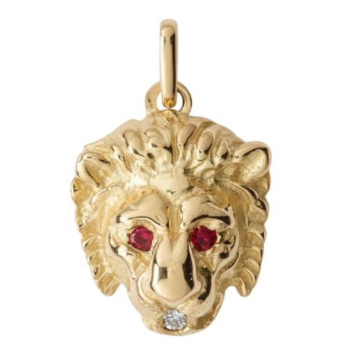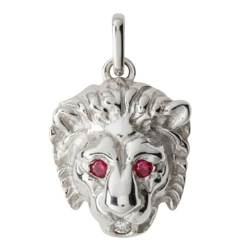 Pendentif tête de lion en or gris rhodié 750/1000 (18 carats) et en relief, serti de deux rubis dans les yeux et d'un diamant naturel de 0.05 carat dans la bouche.