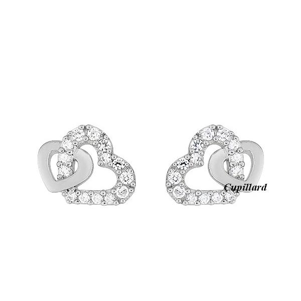Boucles d'oreilles femme deux coeurs entrelacés en argent rhodié 925/1000 dont un pavées d'oxyde de zirconium.