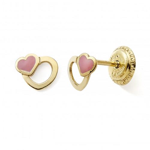 Romantiques, ces boucles d'oreilles double coeurs laquées rose pour enfant en or jaune 375/1000 (9 carats).