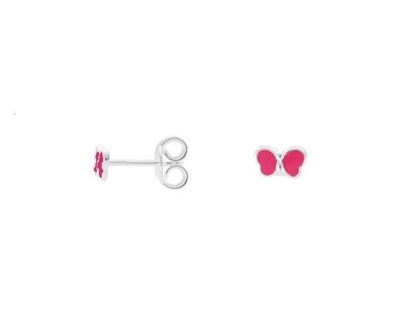 Boucles d'Oreilles Enfant Papillon Laque Rose en Argent 925/1000 Rhodié. 335237