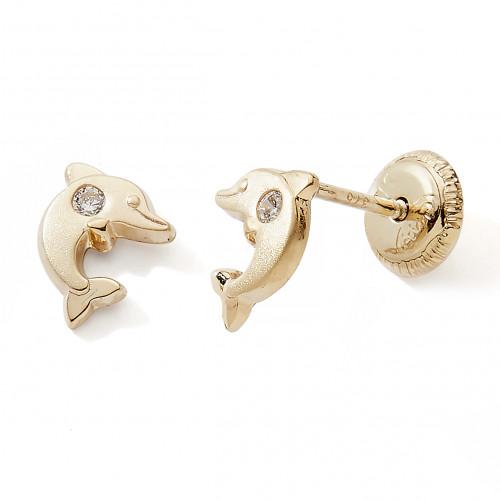 Boucles d'oreilles motifs dauphins sertis d'un zircon en or jaune 375/1000 (9 carats) mat et brillant pour enfant.