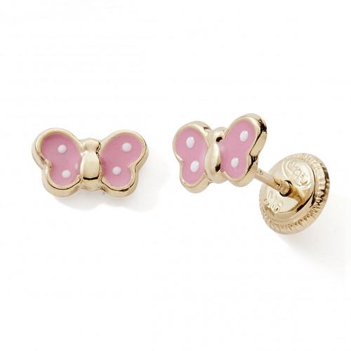 Estivales, ces boucles d'oreilles papillons laqués roses pour enfant sont en or jaune 375/1000 (9 carats).