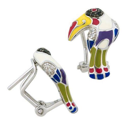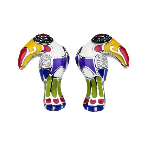 Boucles d'oreilles Una Storia Toucan clip-tige en argent 925/1000 rhodié, laquagen multicolore à la main et serties d'oxydes de zirconium .