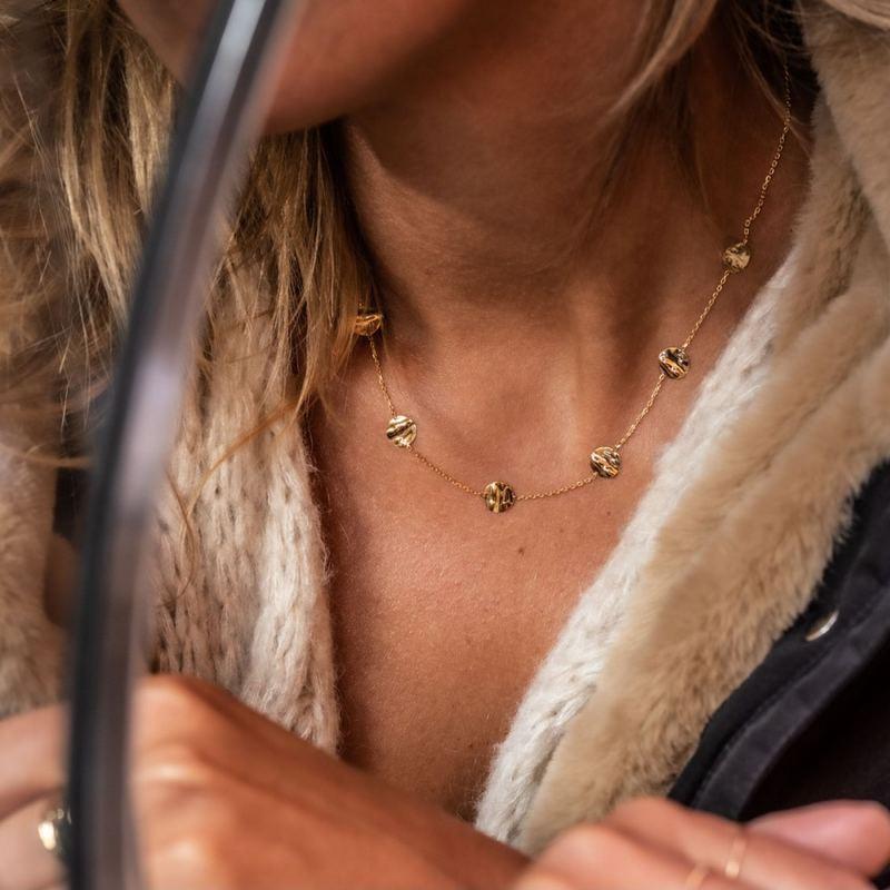 Ravissant collier maille forçat avec 7 pastilles rondes en or jaune froissé 375/1000 (9 carats) de la marque Scarlett Ballet.
