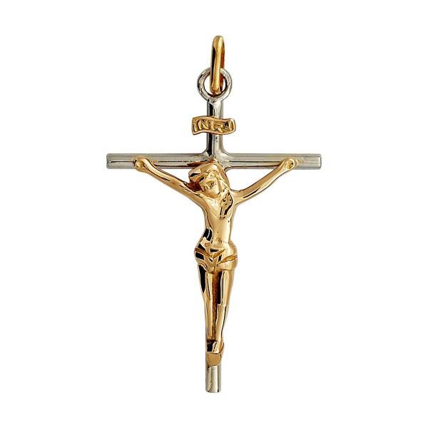 Pendentif croix massive en or gris non rhodié et or jaune 750/1000 (18 carats) avec le Christ. 40 mm de haut et 25 mm de large. Fabrication Française. Livraison France métropolitaine et Corse offerte. K1296