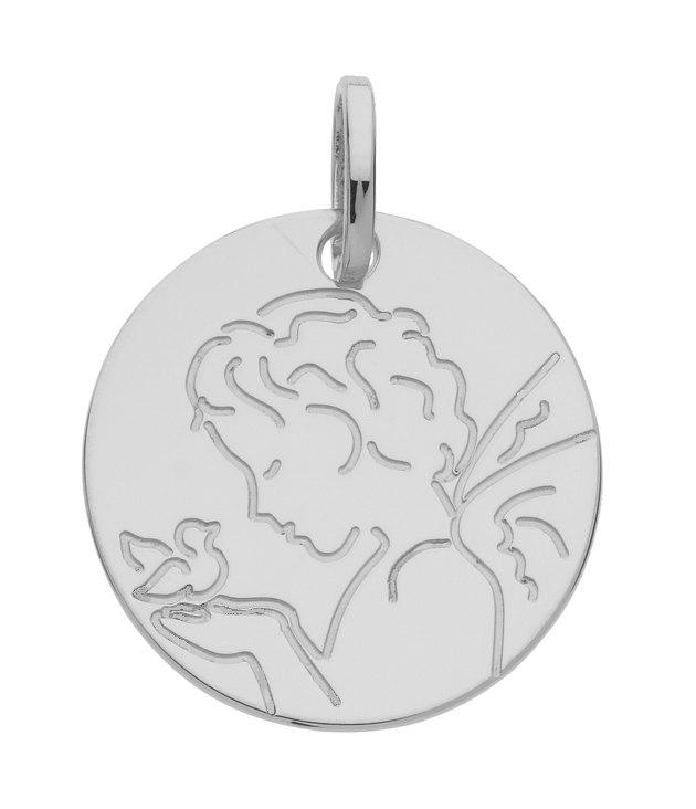 Pendentif ange et colombe en or gris rhodié 375/1000 (9 carats) ronde et polie de 16 mm de diamètre. Gravure et livraison France métropolitaine offertes. D26313