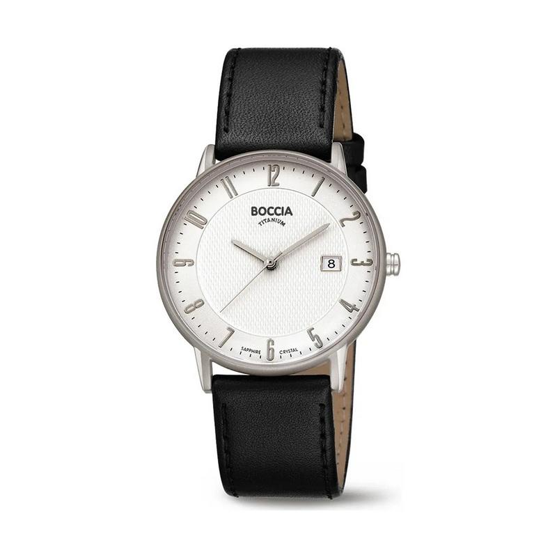 Montre Homme Boccia au Style Classique, en Titane Mat Pur Hypoallergénique (Boîte, Fond, Couronne et Boucle en Titane) : Légère et Agréable au Quotidien. Cadran Blanc Avec Chiffres Arabes Noirs, Bracelet Lisse en Cuir Noir Véritable. Boîtier 38 MM, Épaisseur 7,5 MM, Verre Saphir et Mouvement Quartz à Pile. Bijouterie Cupillard Belfort : Revendeur Officiel des Montres et Bijoux Titane Boccia. 3607.04