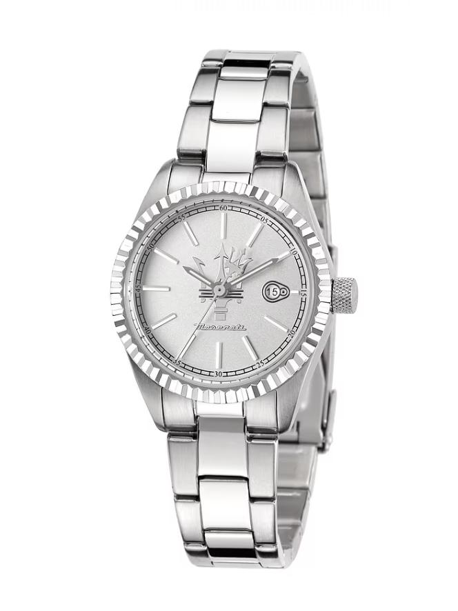 Cadran : Argenté, Diamètre 31 MM, Épaisseur, avec Dateur, Orné du Logo Trident Maserati, Rehaussé d’Index et d’Aiguilles Gris,