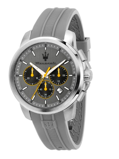 La Maserati Successo Allie Élégance et Sportivité. Son Cadran Gris est Sublimé par des Compteurs de Chronographe Aux Détails Orange. Avec son Bracelet en Silicone Gris, elle Offre Confort et Précision au Quotidien.
