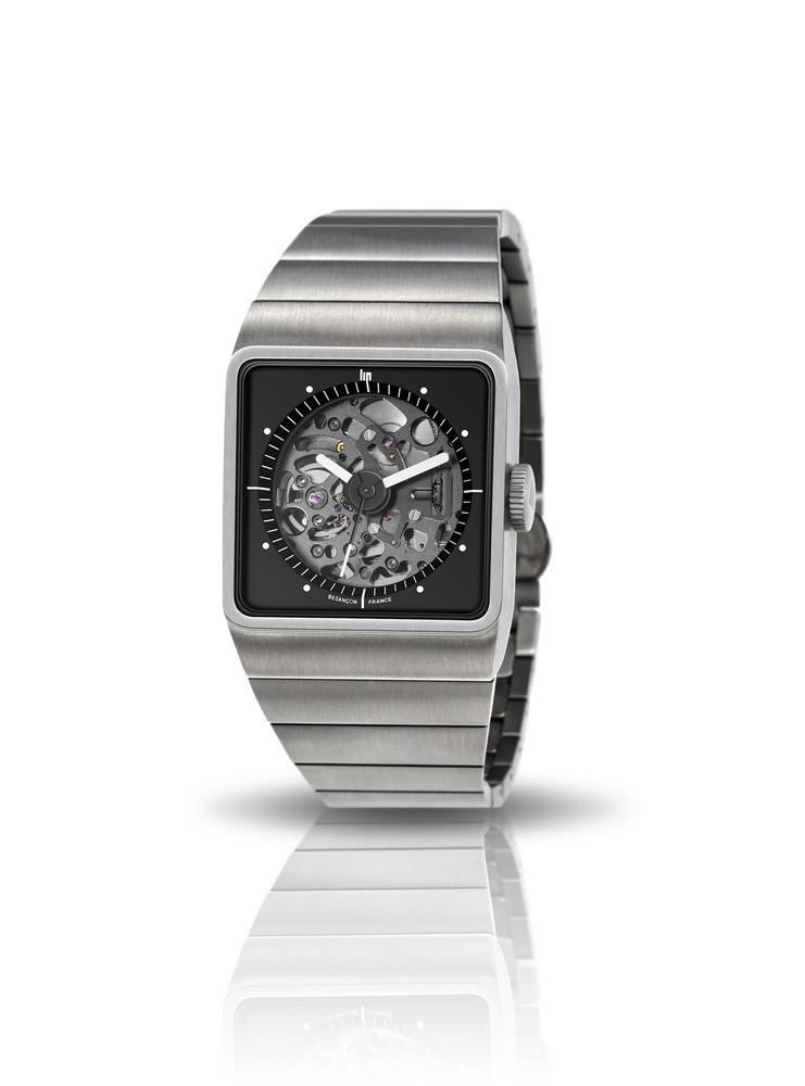Montre Homme Lip Big TV Titane Automatique Squelette de 35 mm de large, boitier et bracelet en Titane léger et anti allergique, cadran noir squeletté, aiguilles et index blancs, verre saphir et mouvement automatique Time Module NH72. Assemblée en France à Besançon. Livraison France métropolitaine offerte. 671656