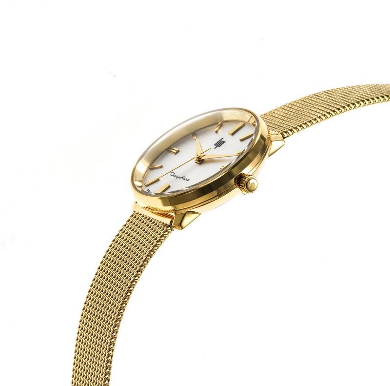 Montre Lip Dauphine femme ronde bracelet milanais et boite en plaqué-or de 29 mm de diamètre est fabriquée dans son bastion français à Besançon.