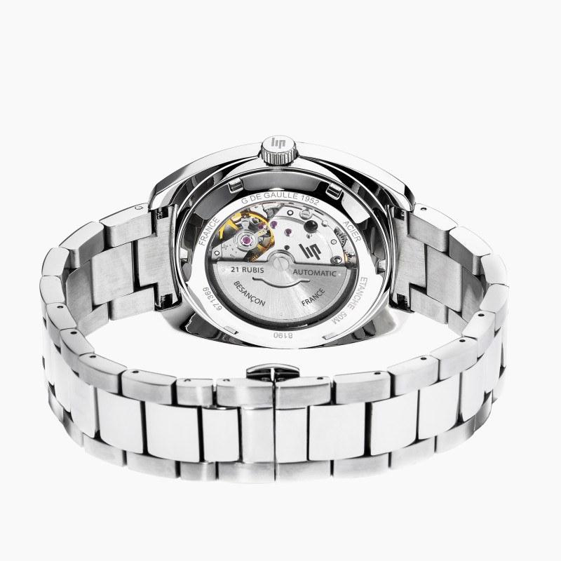 Un peu d'Histoire Lip : Le modèle baptisé « Général de Gaulle » est le fruit de nombreuses années de recherche pour mettre au point la première montre électronique . Le prototype a été présenté par Fred LIP en Mars 1952 à l'académie des sciences de Paris et constitue à ce jour la première marche vers les montres à quartz. Cette GDG Electronic est également chargée d'histoire puisque deux montres de ce type ont été offertes au Général de Gaulle en 1958, ce qui explique l'appellation donnée aujourd'hui, elle a également été offerte au Général Eisenhower ou plus récemment aux Présidents Bill Clinton et François Hollande. Cette montre Lip Général de Gaulle est maintenant proposée avec un mouvement Automatique (sans pile).
