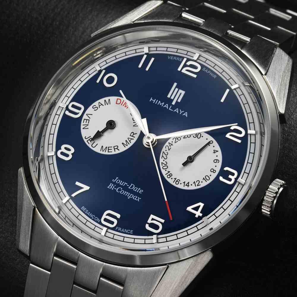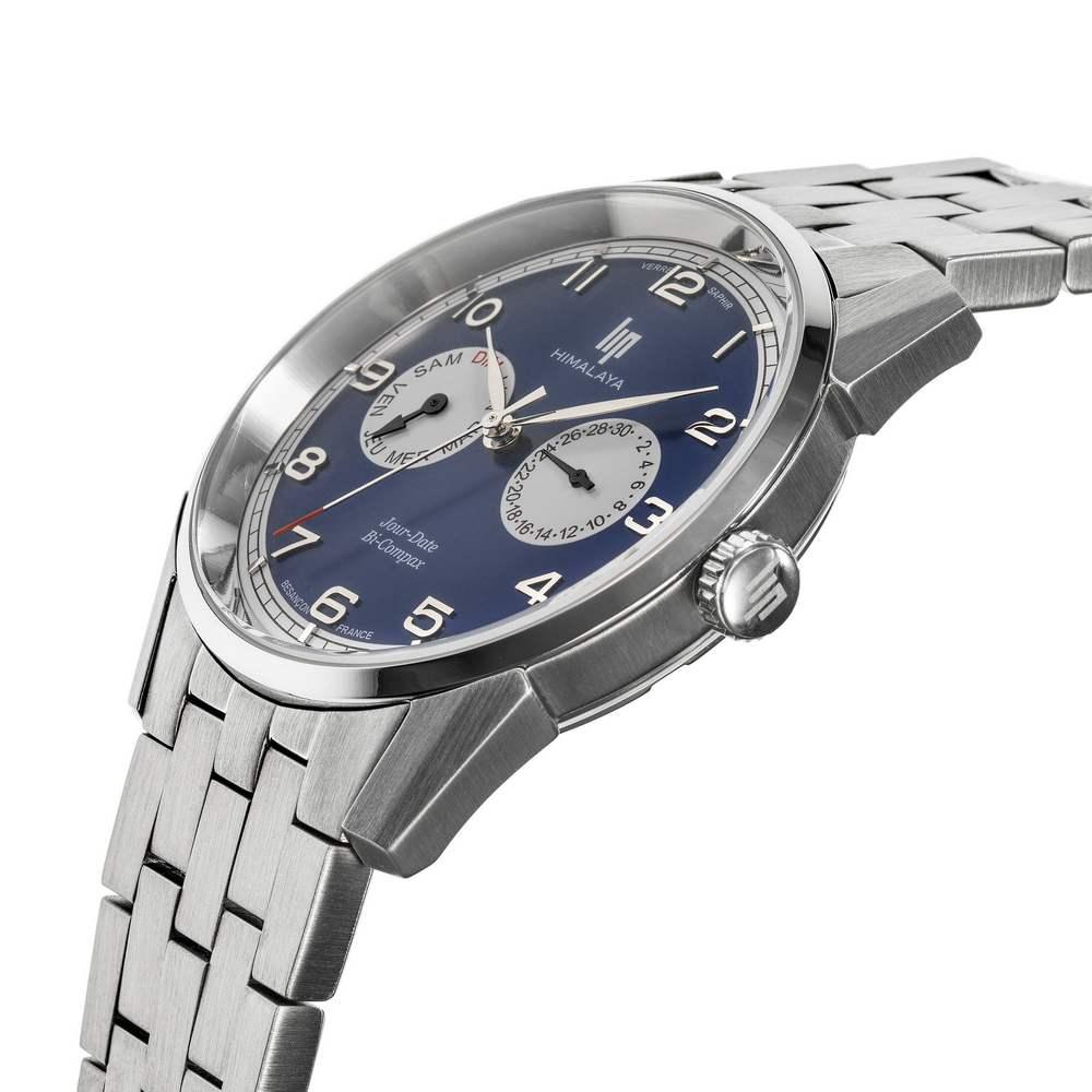 Montre homme Lip Himalaya Bi Compax ronde de 40 mm de diamètre sur bracelet acier, cadran bleu avec indication du jour en chiffres et en lettres dans deux cadrans blancs, mouvement quartz Time Module VH64, Assemblée en France à Besançon. Livraison France métropolitaine offerte. 671675