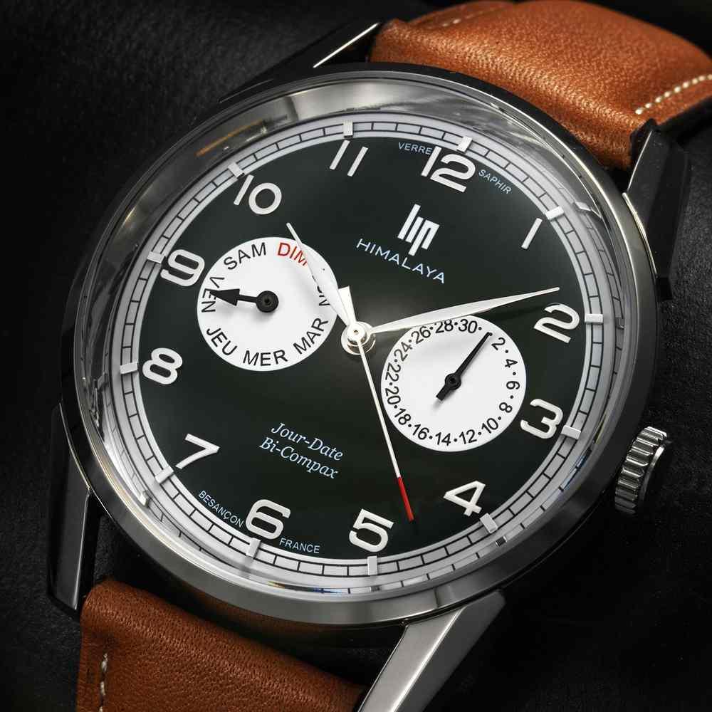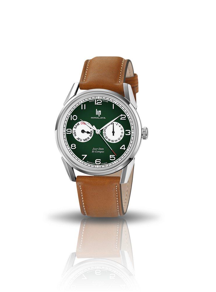 Montre homme Lip Himalaya Bi Compax ronde de 40 mm de diamètre sur bracelet cuir lisse marron, cadran vert avec indication du jour en chiffres et en lettres, mouvement quartz Time Module VH64, Assemblée en France à Besançon. Livraison France métropolitaine offerte. 671674