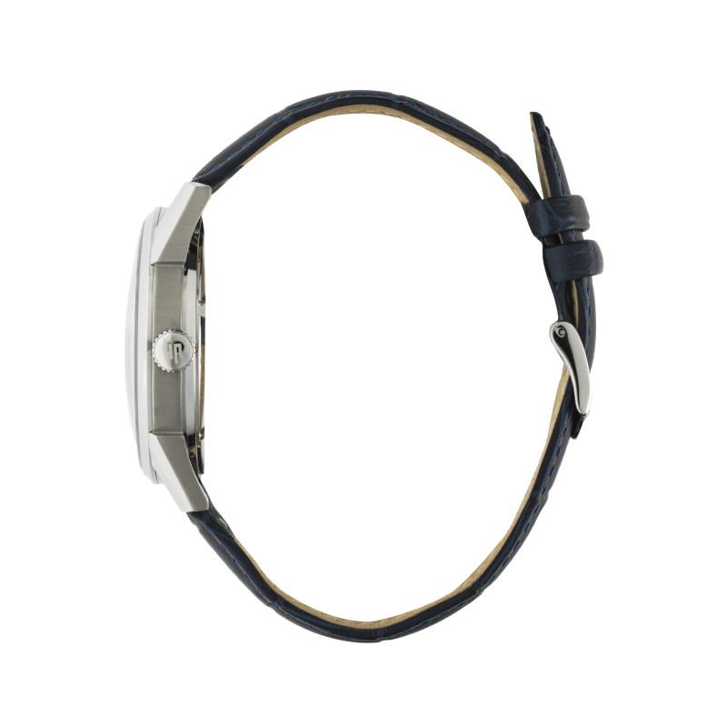 - Bracelet en cuir de vachette, effet crocodile bleu foncé, surpiqué en ton sur ton avec boucle ardillon en acier,