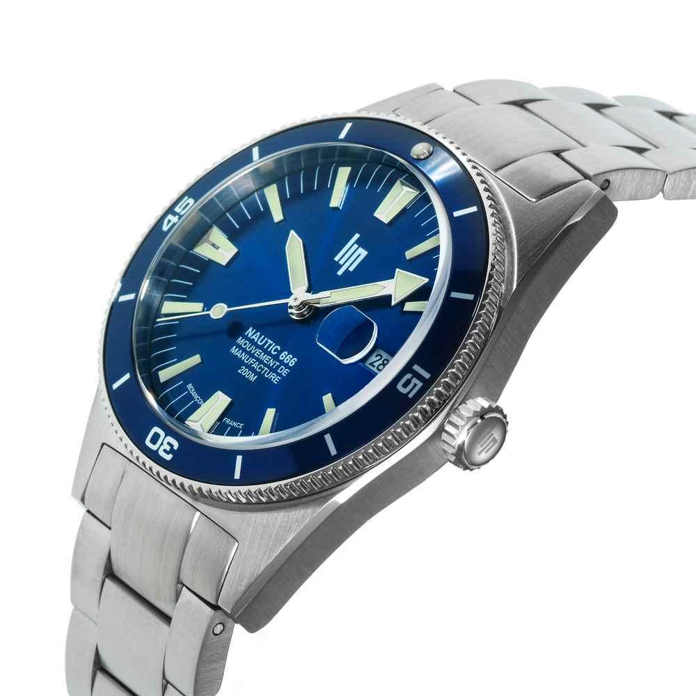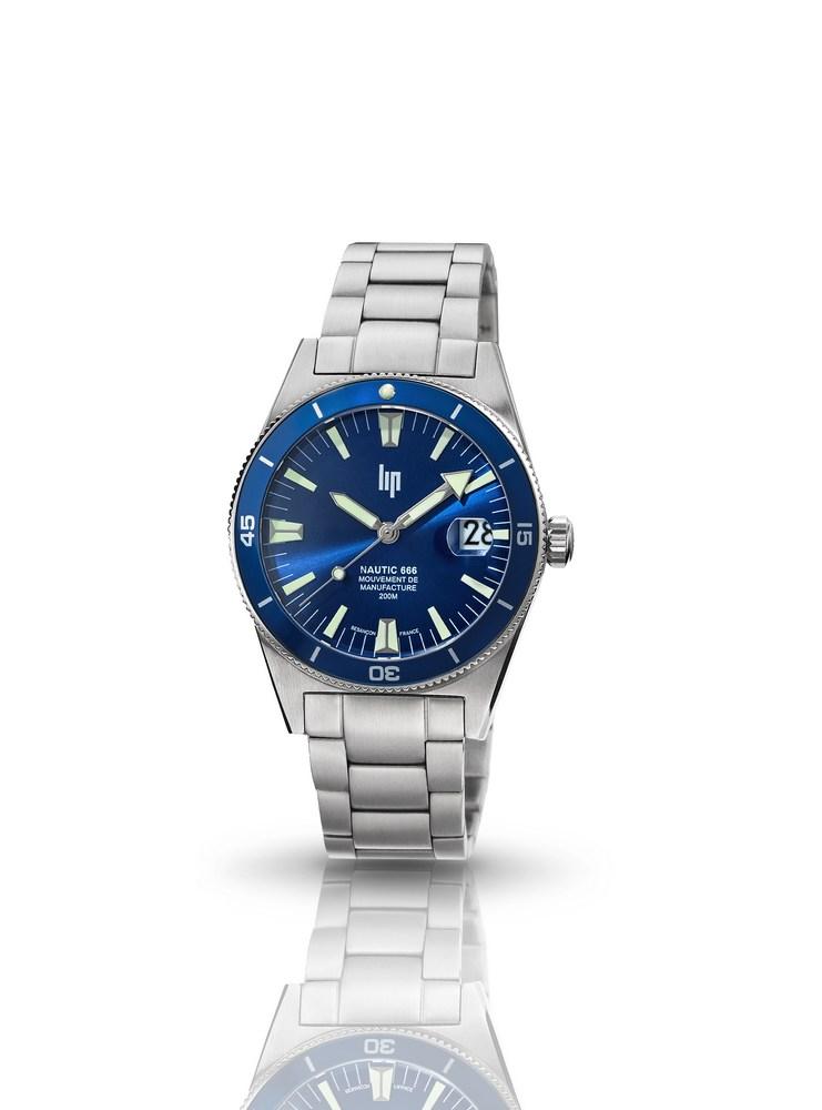 La Montre Lip Nautic 666 Automatique, Equipée du Mouvement de Manufacture Automatique LIP R26 fabriqué à Besançon parée d'un boîtier en acier brossé de 39 mm de diamètre avec une lunette tournante unidirectionnelle munie d'un insert en aluminium anodisé bleu, cadran bleu, index et aiguilles luminescents protégés par un verre saphir avec loupe. Elle se porte sur un bracelet acier brossé à boucle déployante. Bijouterie Cupillard Belfort Mulhouse : Revendeur Officiel Lip Mouvement de Manufacture. 676052