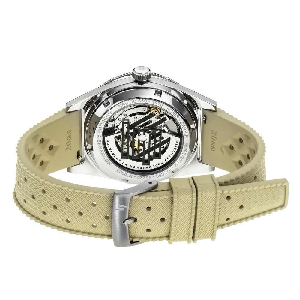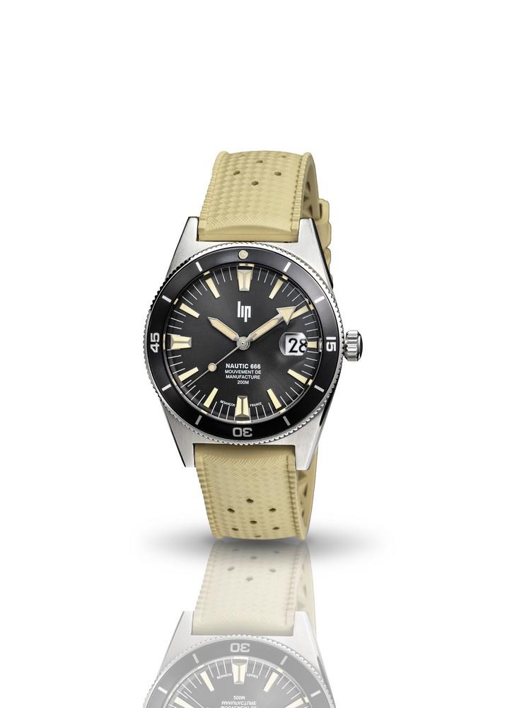 La Montre Lip Nautic 666 Automatique, Equipée du Mouvement de Manufacture Automatique LIP R26 fabriqué à Besançon. Parée d'un boîtier en acier brossé de 39 mm de diamètre avec une lunette tournante unidirectionnelle munie d'un insert en aluminium anodisé noir, cadran noir, index et aiguilles luminescents protégés par un verre saphir avec une loupe. Elle se porte sur un bracelet en élastomère beige avec une boucle ardillon chromée siglée LIP. Bijouterie Cupillard Belfort Héricourt : Revendeur Officiel Lip Mouvement de Manufacture. 676054