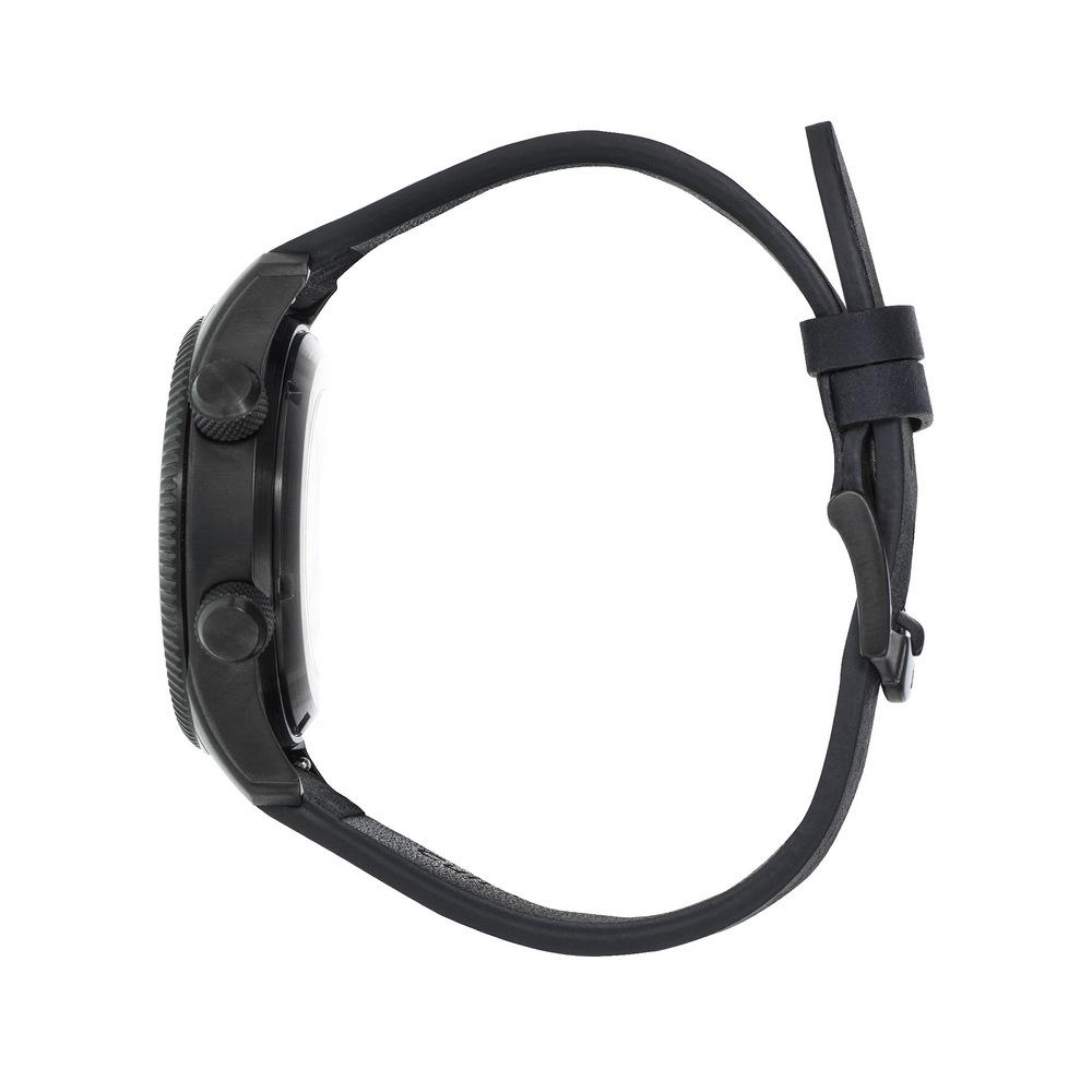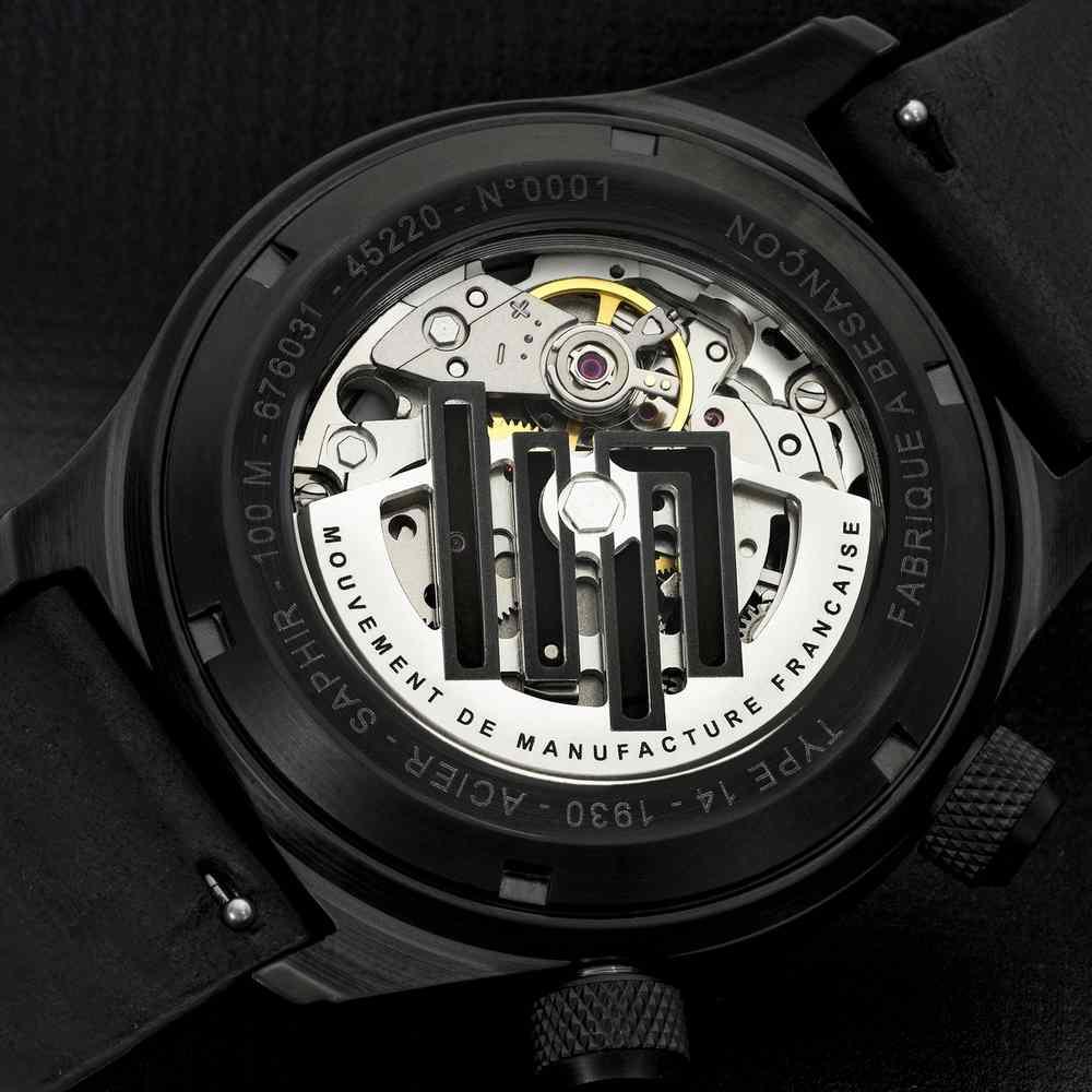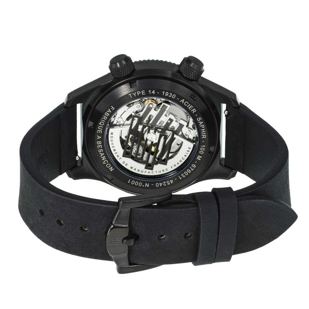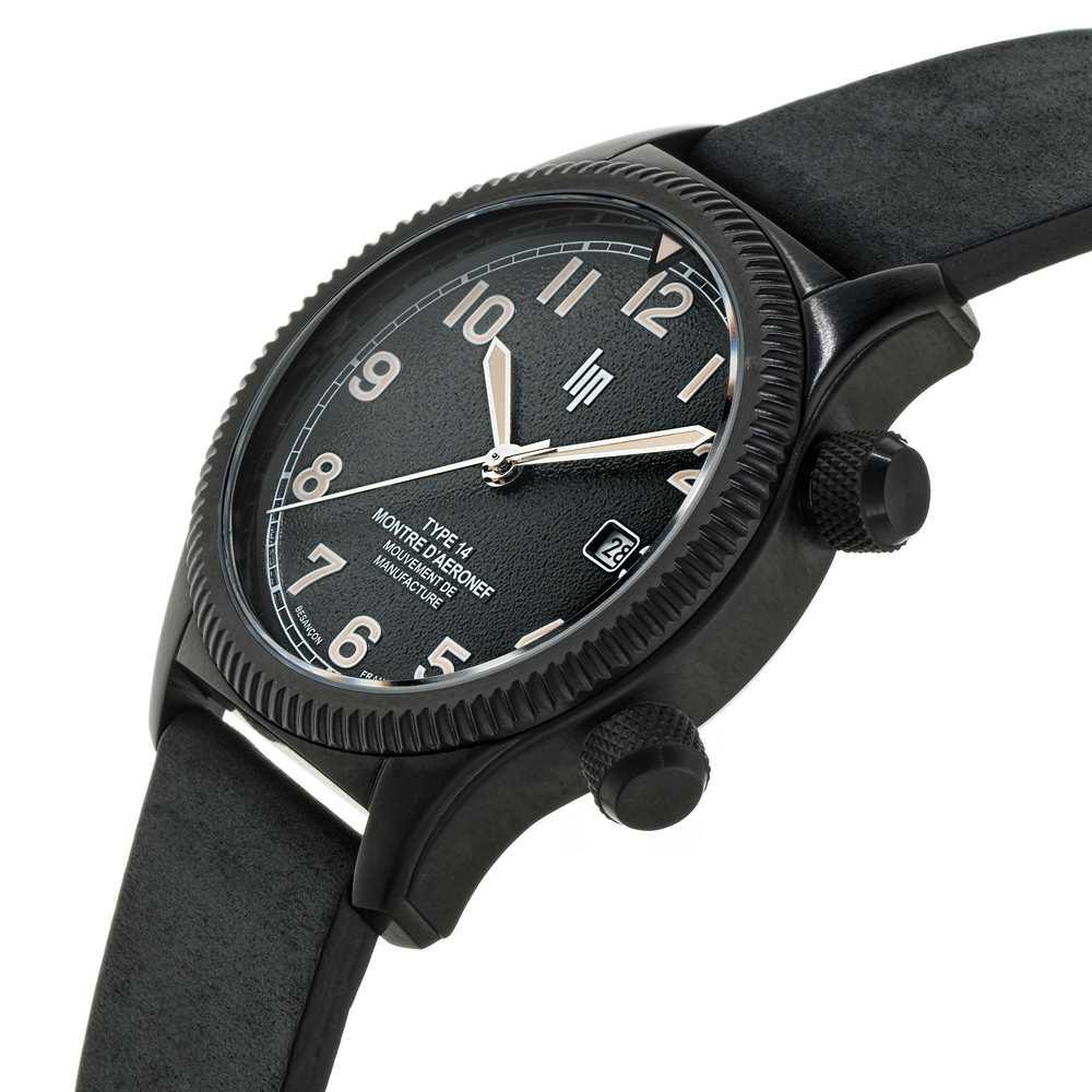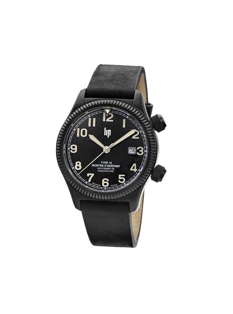 Inspirée de la montre d'aéronef Type 14, Equipée du Mouvement de Manufacture Automatique LIP R26 parée d'un boîtier en acier PVD noir de 41 mm de diamètre avec une lunette interne tournante bidirectionnelle et index triangulaire. Habillée d'un cadran noir texturé façon tarmac d'aéroport munis de chiffres arabes luminescents, protégé par un verre saphir légèrement bombé traité antireflet. elle est motorisée par le calibre LIP R26, premier mouvement mécanique à remontage automatique de fabrication bisontine depuis Fred LIP. Elle se porte sur un bracelet en cuir noir façon nubuck fermé par une boucle ardillon exclusive à LIP Manufacture. Bijouterie Cupillard Belfort : Boutique Officielle Lip Mouvement de Manufacture. 676031