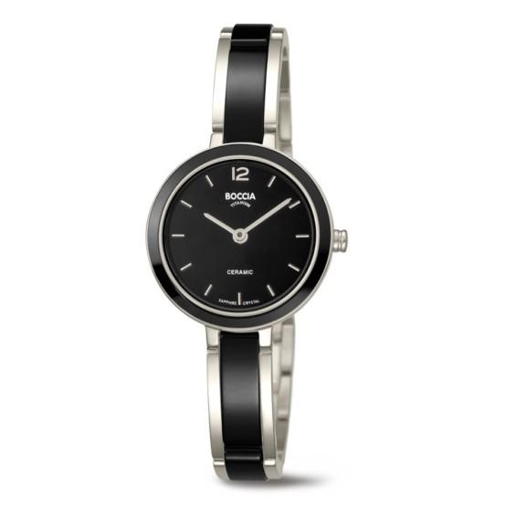 Montre Femme Boccia en Titane Anti Allergique et Céramique Noire. Verre Saphir et Cadran Noir, Diamètre 28 mm. Mise à taille et livraison France métropolitaine offertes. 3333.02