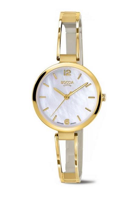 Montre Boccia Femme Ronde en Titane PVD Jaune Mat et Poli, Diamètre 30 mm, Cadran en Nacre Blanche et Verre Minéral Saphir. Titanium Anti Allergique et léger. Mise à Taille, Livraison France Métropolitaine et Corse Offertes. Bijouterie Cupillard : Boutique Officielle des Montres en titane Boccia. 3354.02