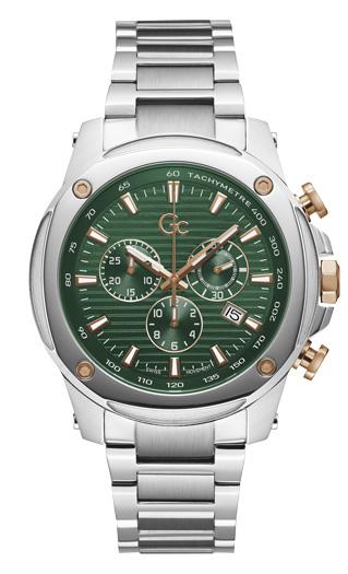 Montre Chronographe GC Brave pour homme, boite et bracelet en acier brillant et brossé, cadran vert, aiguilles et index dorés roses. MOUVEMENT SUISSE. Livraison France métropolitaine et mise à taille offertes. Z13003G9MF