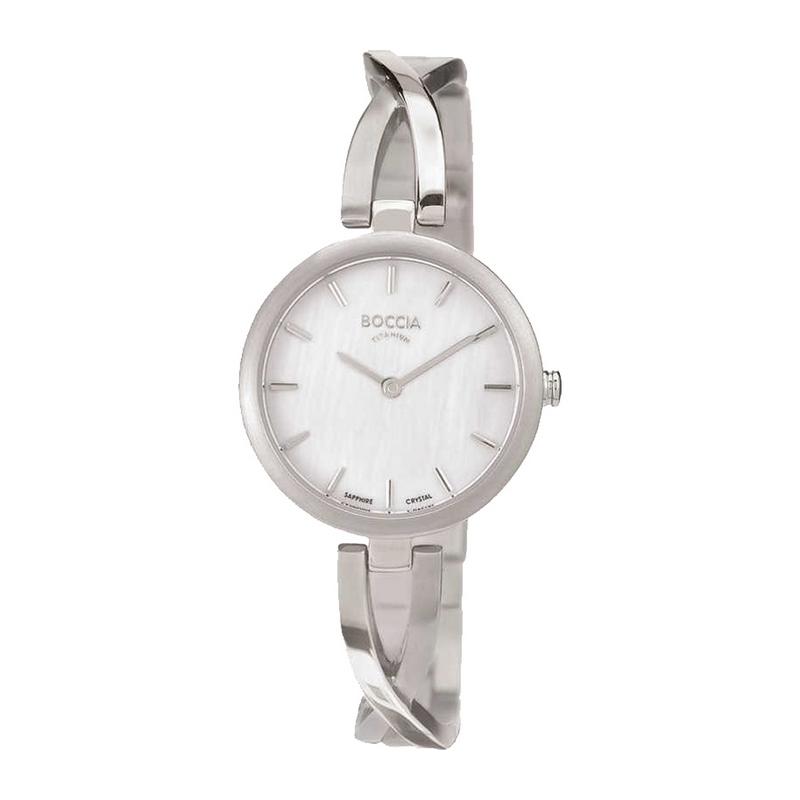 Montre Femme Ronde Titane Mat et Brillant, Cadran Nacre Blanche avec un Verre Saphir. Diamètre de la Boite de Montre 28 mm. Boccia Titanium Anti Allergique. Mise à Taille + livraison France Métropolitaine et Corse Offertes. Bijouterie Cupillard à Belfort : Distributeur Officiel des montres et bijoux titane Boccia. 3239.01