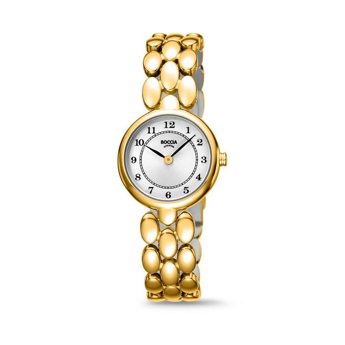 Montre Boccia Dame en Titane PVD Jaune, Dotée d’un Boîtier Rond de 26 MM et 7 MM d’Épaisseur. Son Cadran Blanc, Orné d’un Motif Soleillé au Centre, est Accompagné d’Index et d’Aiguilles Noirs, le Tout Protégé par un Verre Saphir Résistant aux Rayures. Le Bracelet en Titane et PVD Jaune, Large de 13 MM, est Équipé d’une Boucle Déployante à Boutons Poussoirs en Titane PVD Jaune. Fond de Boîte en Titane Pressé et Mouvement Quartz Fiable. Mise à Taille et Livraison Offertes en France Métropolitaine et en Corse. Bijouterie Cupillard Belfort : Boutique Officielle des Montres Boccia. 3378.03