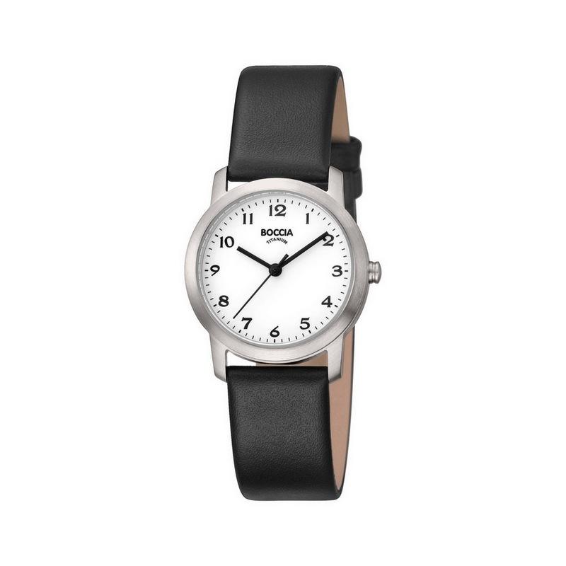 Montre Boccia Femme Ronde en Titane Brossé, Bracelet Cuir Lisse Noir, Cadran Blanc avec Index Chiffres Arabes Noirs, Diamètre de la Boite de Montre : 29 mm. Boccia Titanium Anti Allergique et légère. Bijouterie Cupillard Belfort : Boutique Officielle des Montre Titane Boccia. 3291.01