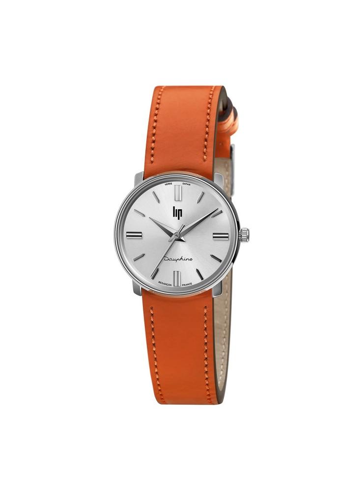 Montre Lip Dauphine femme ronde bracelet cuir lisse marron et boite en acier de 29 mm de diamètre est fabriquée dans son bastion français à Besançon.