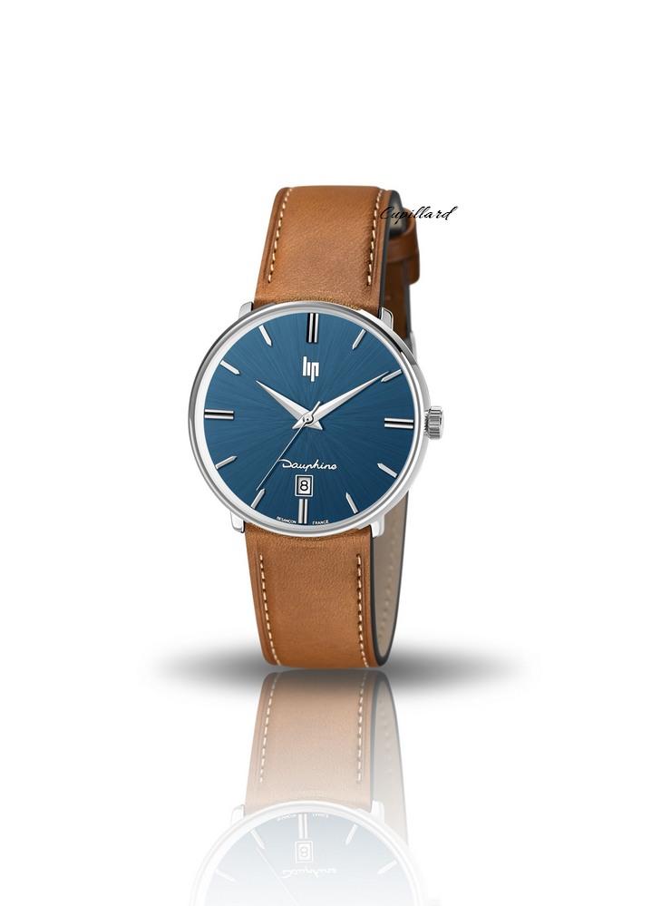Montre Lip Dauphine ronde bracelet en cuir lisse marron clair, boite acier 38 mm de diamètre avec un cadran bleu foncé est fabriquée dans son bastion Français à Besançon.