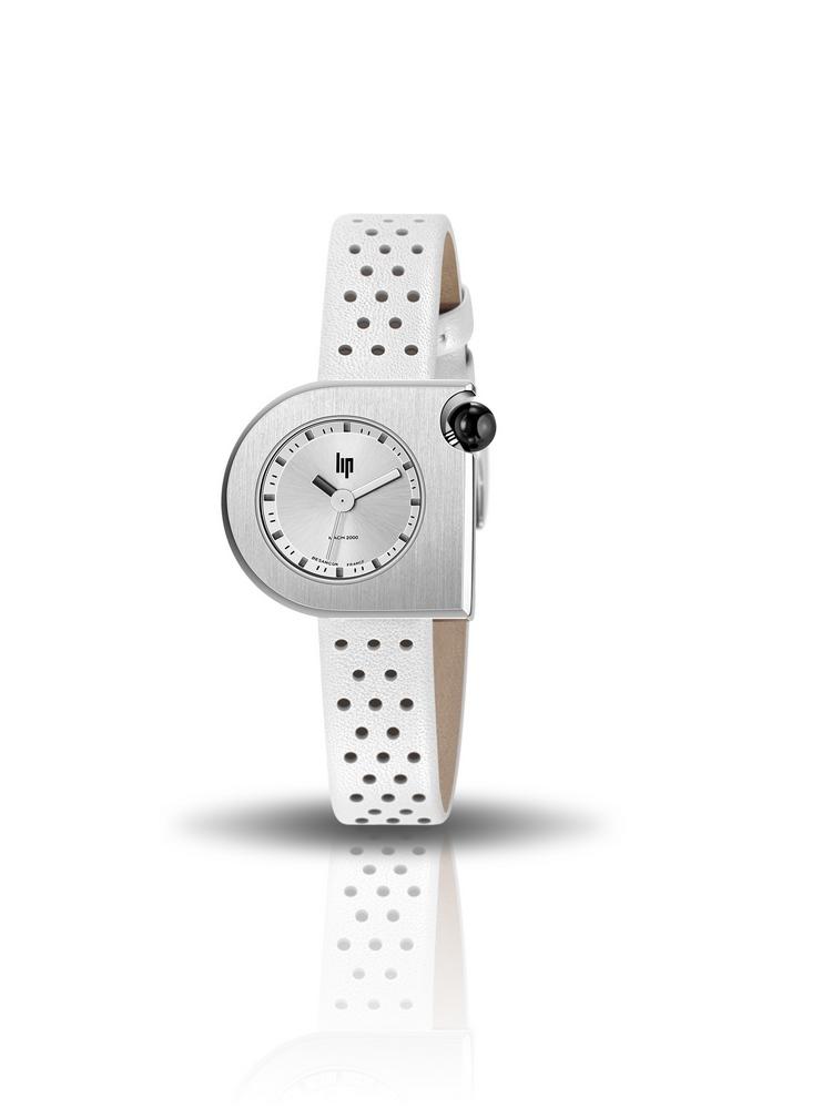 Dessinée par Roger Tallon en 1975, cette montre dame Lip Mach 2000 Mini Moon en acier brossé de forme asymétrique est adaptée sur un bracelet en cuir blanc perforé.