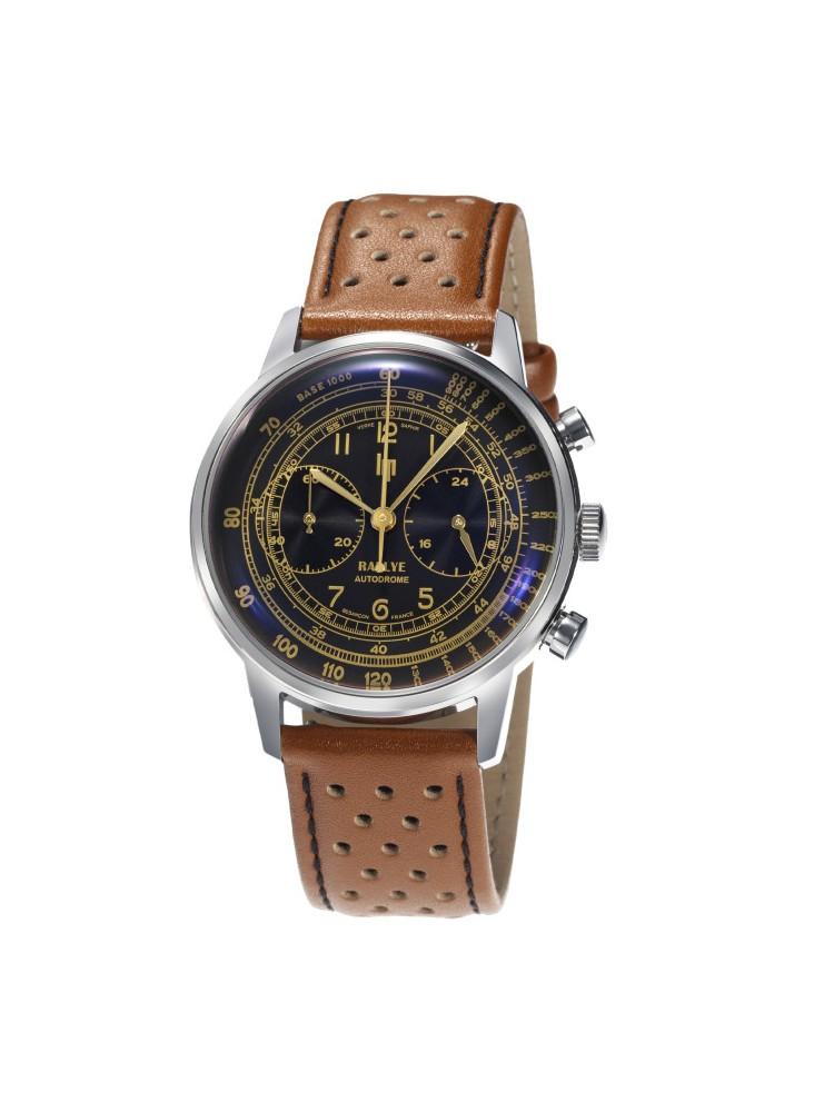 Inspirée de l'univers automobile des années 60 - 70, La montre Lip Rallye chronographe à mouvement Hybride (système horaire quartz + chronographe sur base mécanique). Le cadran Noir avec ces compteurs, aiguilles et indication Tachymétrique dorées, soulignent le coté sportif vintage de ce garde temps.
