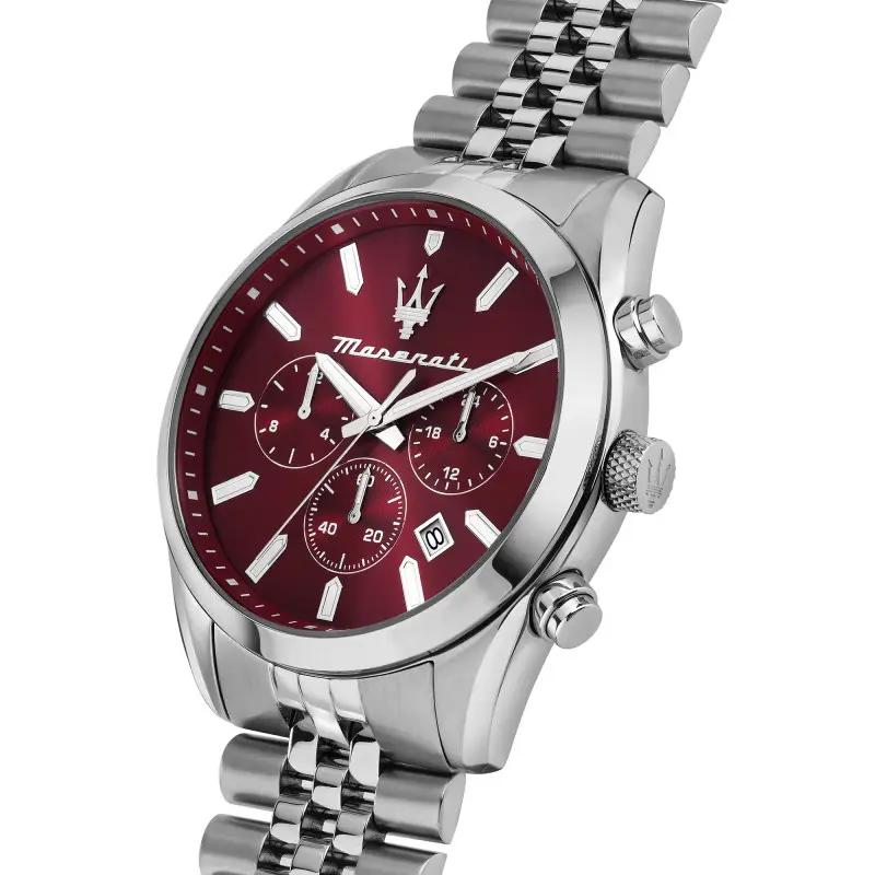 Montre Homme Maserati Attrazione, Mouvement Chronographe Quartz VD 33, Boite de 43 MM de Diamètre, Cadran Bordeaux et Bracelet Acier Mat et Poli, Verre Minéral, Logo Trident Maserati. Mise à taille, livraison France métropolitaine et Corse offertes. R8853151024