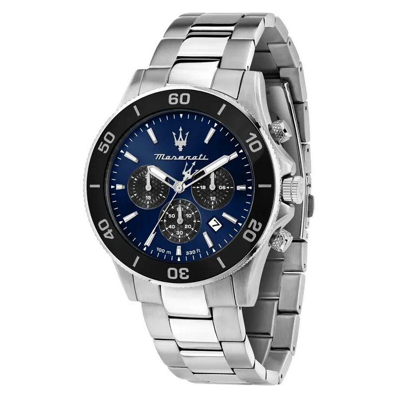 Montre Homme Maserati Competizione Chronographe Cadran Bleu, Mouvement Quartz Miyota JS25, Boite de 43 MM de Diamètre et Bracelet en Acier, Verre Minéral, Logo Trident Maserati. Mise à taille et livraison France métropolitaine offertes. R8873600009