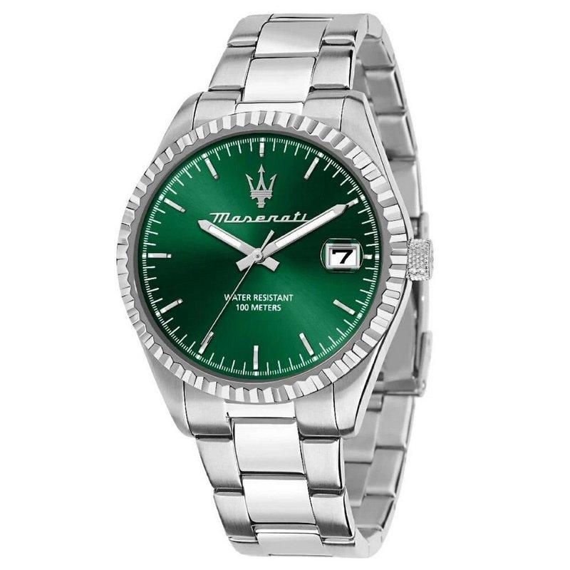 Montre Homme Maserati Competizione, Mouvement Quartz Miyota 2415, Boite de 43 MM de Diamètre, Cadran Vert et Bracelet Acier Mat et Poli, Verre Minéral, Logo Trident Maserati. Mise à taille et livraison France métropolitaine offertes. R8853100043