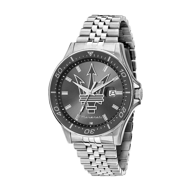 Montre Homme Maserati Sfida, Mouvement Quartz Miyota 2315, Boite de 44 MM de Diamètre et Bracelet Acier, Verre Minéral, Logo Trident Maserati. Mise à taille et livraison France métropolitaine et Corse offertes. R8853140010