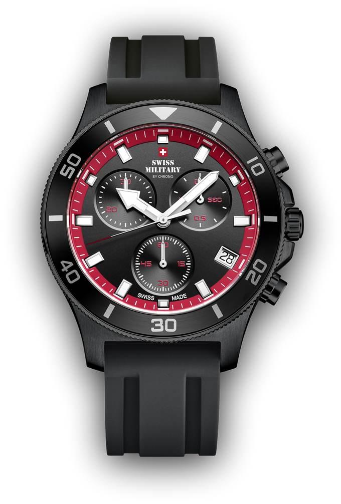 • Les index ainsi que les aiguilles en partie lumineux la nuit et le cadran rouge et noir de cette montre Swiss Military by Chrono AG, apportent un style typé sport à ce garde temps.