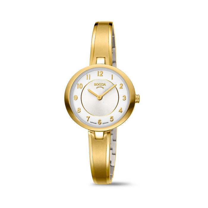 Montre Boccia Dame en Titane PVD Jaune, Dotée d’un Boîtier Rond de 30 MM pour 7 MM d’Épaisseur. Son Cadran Blanc est Orné d’un Motif Soleillé au Centre, Accompagné d’Index et d’Aiguilles en PVD Jaune, le Tout Protégé par un Verre Saphir Résistant Aux Rayures. Le Bracelet en Titane et PVD Or Jaune, Large de 9 MM, est Équipé d’une Boucle Déployante. Fond de boîte en Titane Pressé et Mouvement Quartz Fiable. Mise à Taille et Livraison Offertes en France Métropolitaine et en Corse. Bijouterie Cupillard Belfort : Boutique Officielle des Montres Boccia. 3377-02
