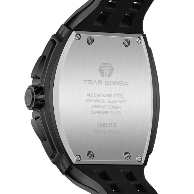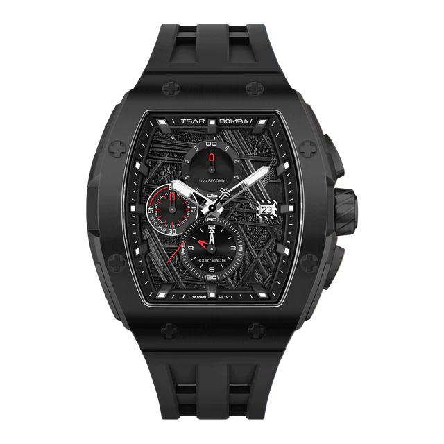 Montre Homme Tsar Bomba Elémental Sport Chic, Chronographe Boite Acier PVD Noir Tonneau Robuste de 46 mm de Large, 51 mm de Hauteur et 15.5 mm d'Epaisseur, Verre Saphir. Equipée du Mouvement EPSON YM92, la Tsar Bomba Allie Performance et Style. Son bracelet en silicone noir durable assure un confort optimal pour un usage quotidien ou sportif. Livraison France Métropolitaine et Corse Offerte. Bijouterie Cupillard Belfort : Boutique Officielle Montres Tsar Bomba. TB8211QII07