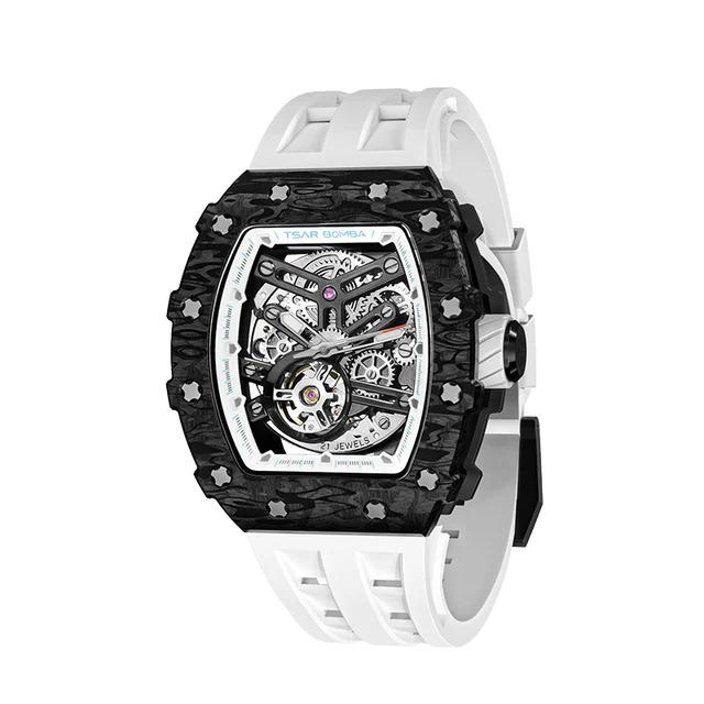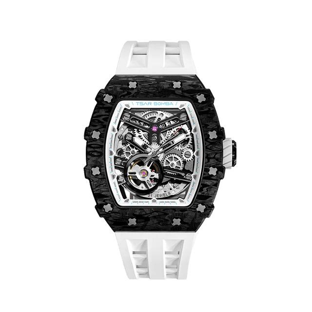 La Tsar Bomba TB8208CF40 est la Montre Automatique Squelette pour les Hommes passionnés de Technologie. Elle Intègre une Lunette en Fibre de Carbone Noir, Le Mouvement Automatique Citizen Miyota 82S0 est mis en Valeur par un Cadran Squelette Audacieux et Protégée par un Verre Saphir. Son boîtier Tonneau en Acier 316L PVD Noir de 43 mm de Large, 50,5 mm de Hauteur et 15.5 mm d'Epaisseur, son Design Inspiré de l'Automobile et son Bracelet en Silicone Blanc Souple en font une Montre de Luxe Abordable, Alliant Performance et Style Futuriste. Livraison France Métropolitaine et Corse Offerte. Bijouterie Cupillard Belfort : Distributeur Officiel des Montres Tsar Bomba.