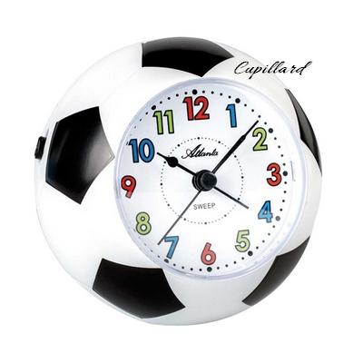 Réveil quartz ballon de football en plastique noir et blanc muni d'un mouvement silencieux, d'une sonnerie Bip-Bip ou musicale, marque Atlanta.