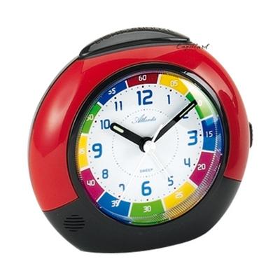 Réveil Quartz à pile pour enfant avec un cadran pédagogique, de couleur rouge et noir muni d'un mouvement silencieux avec une sonnerie bip-bip progressive et à répétition, marque Atlanta.