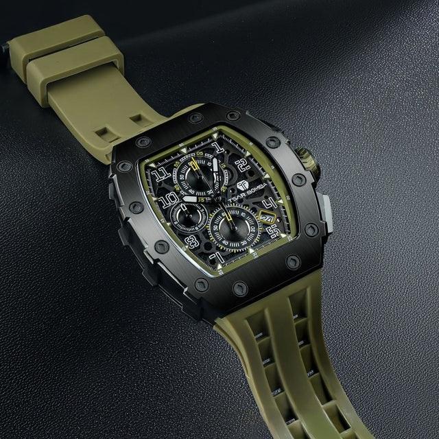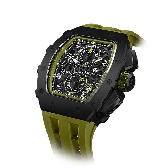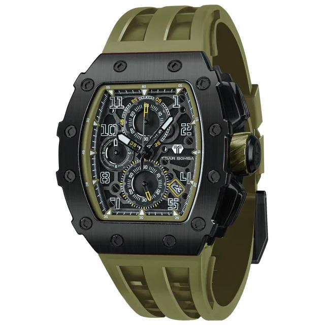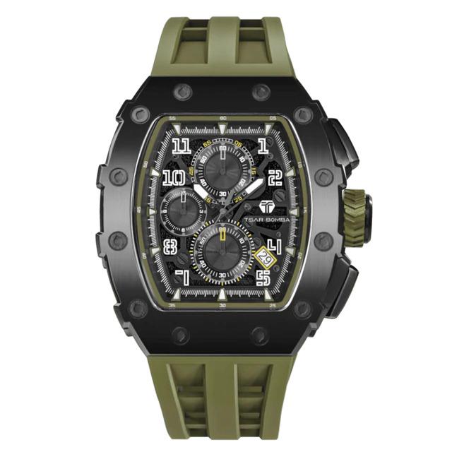 La Montre Tsar Bomba TB8204Q38 est le chronographe Sport pour Homme au Design Tonneau Affirmé, avec un Boîtier Noir en Acier 316L de 43 mm de Large, 50,5 mm de Hauteur et 15.5 mm d'Epaisseur. Le Bracelet Silicone Kaki/Olive, lui Confère un Look Militaire. Protégée par un Verre Saphir, elle Garantit une Lisibilité et une Durabilité Supérieures. Animée par un Mouvement à Quartz Seiko TMI VK67 Japonais Fiable, elle offre la Fonction Chronographe et Date. C'est une Montre de Luxe Abordable, parfaite pour l'Homme Actif. Livraison France Métropolitaine et Corse Offerte. Bijouterie Cupillard Belfort : Boutique Officielle des Montres Tsar Bomba.