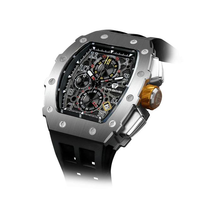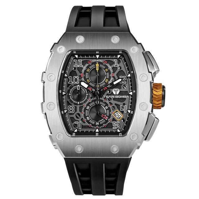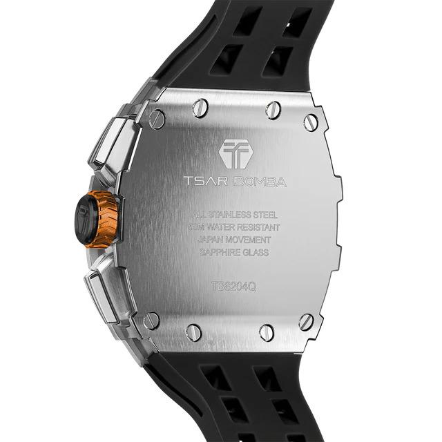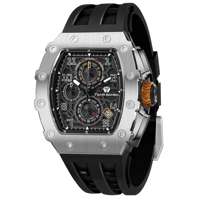 Montre Homme Tsar Bomba Elémental Acier Silicone Noir Sport Chic. Chronographe Boite Acier Tonneau Robuste de 43 mm de Large, 50,5 mm de Hauteur et 15.5 mm d'Epaisseur, Verre Saphir. Equipée du Mouvement Seiko TMI VK67, la Tsar Bomba Allie Performance et Style. Son Bracelet en Silicone Noir Durable Assure un Confort Optimal pour un Usage Quotidien ou Sportif. Livraison France Métropolitaine et Corse Offerte. Bijouterie Cupillard Belfort : Boutique Officielle Montres Tsar Bomba. TB8204Q31