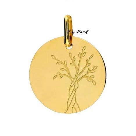 Médaille Arbre de Vie ronde en or jaune 375/1000 (9 carats) . Cette représentation symbolise la force de la vie et ses origines, l'importance des racines et le développement de la vie.