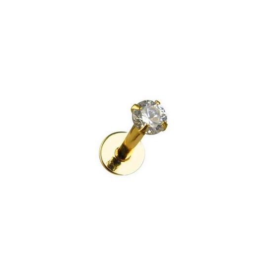 Labret or jaune 750/1000 (18 carats), diamant naturel 0.02 carat serti grace à quatre griffes. Le motif avec le diamant se visse sur la tige et le palet reste fixe.