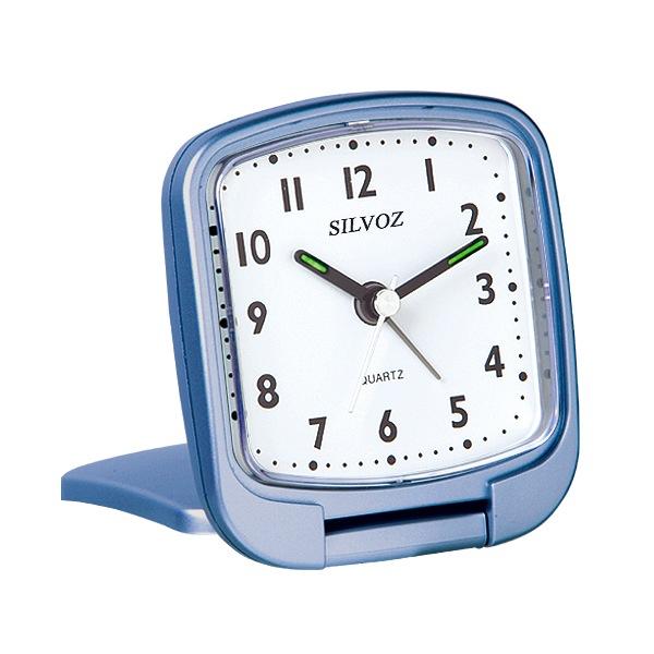 Réveil de voyage à quartz en plastique bleu clair, avec sonnerie Bip Bip progressive et répétition, éclairage du cadran par simple pression sur le verre, de la marque Silvoz.